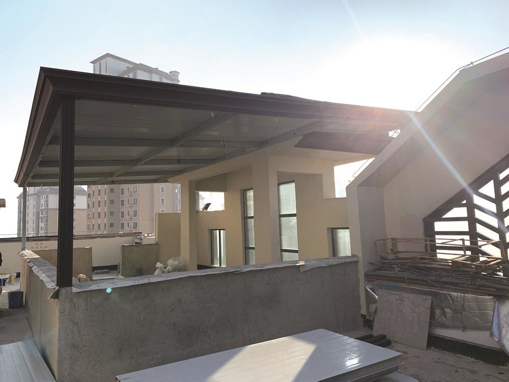14号楼位于该小区的西北侧,从外观上看共有18层,楼顶有一面镶嵌玻璃的墙壁。记者与督办员坐电梯上到18楼后,通过安全通道的楼梯来到了楼顶。眼前的一幕令人十分震惊:天台上赫然伫立着两间高度约为2米、面积约为33平方米的房屋。这两间房屋均以楼顶原有的墙壁为依托,向墙壁的背面拓展出房屋主体。西侧的房屋基本由玻璃围墙构成,天台西侧的排水沟已经被堵住,只留有一个排水口,屋内放置了一些建筑垃圾;东侧的房屋已经建好八成,只剩下门窗还没有安装,天台东侧的部分排水沟被堵住。西侧房屋内部地面被打通,疑似要安装电梯。记者还在天台原有的墙壁上看到了已经安装好的LED防雨开关电源。