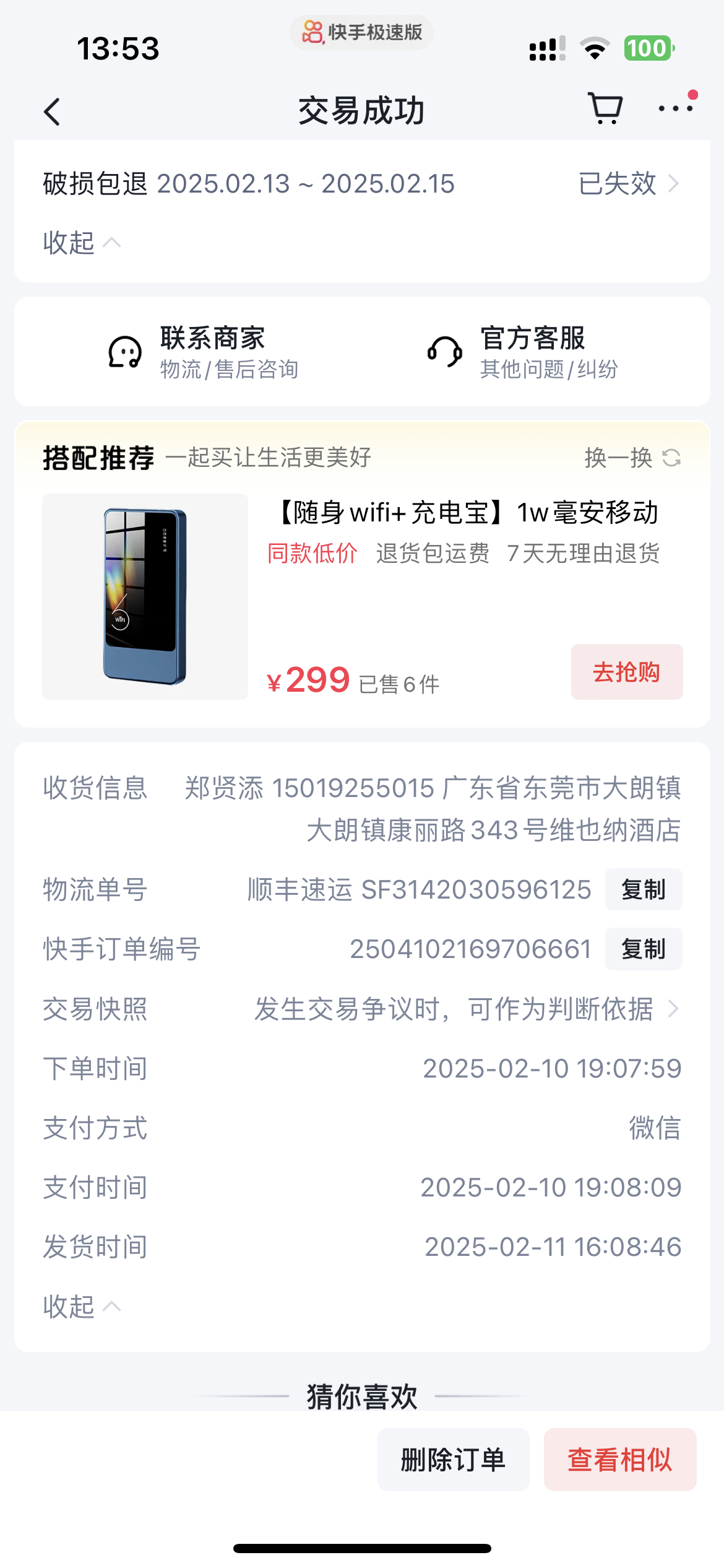 快手平台上买的一款随身WI-FI用没多久网速不行,商家让我寄回去。寄回去后不处理。 商家信息:中国北斗,15668017569山东省烟台市烟台高新技术产业开发区马山道蓝色智谷10号楼11楼1102室