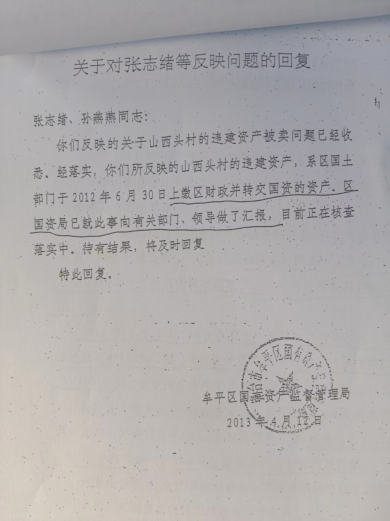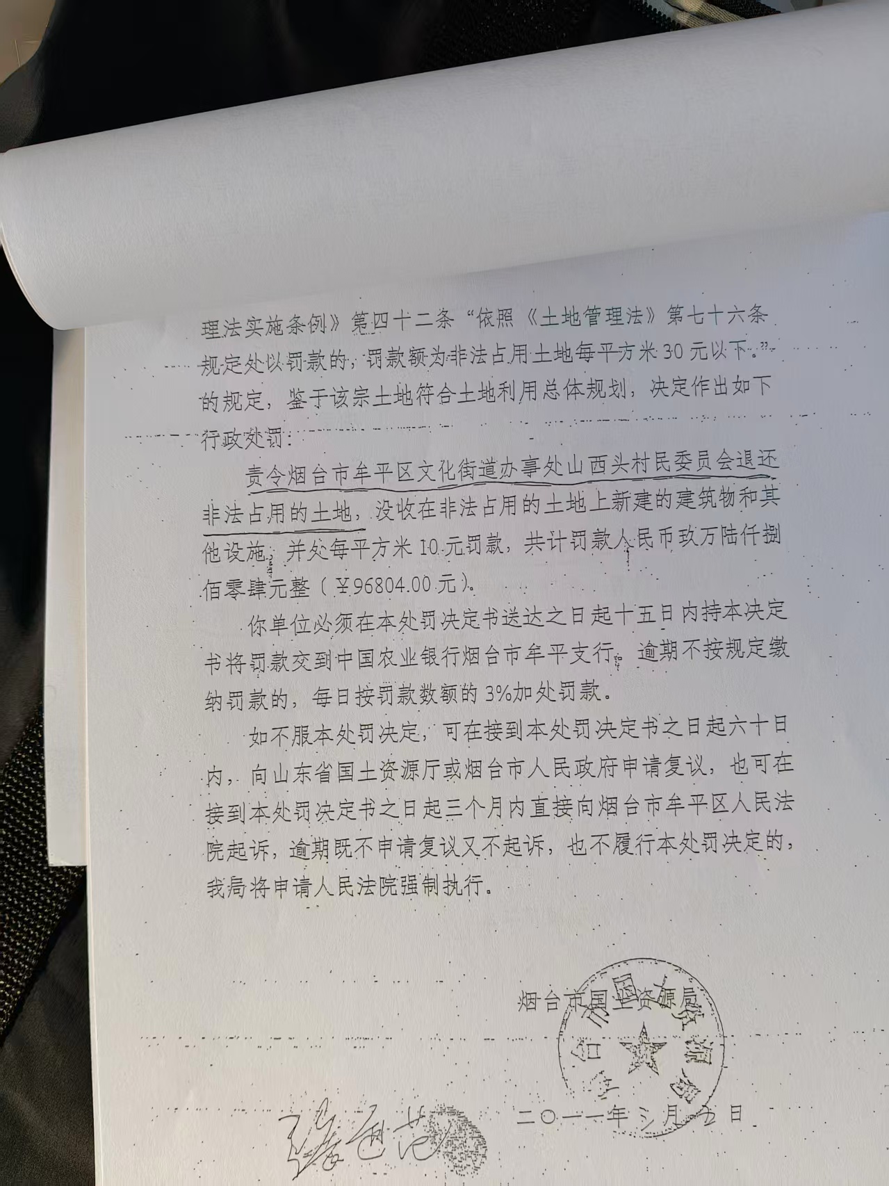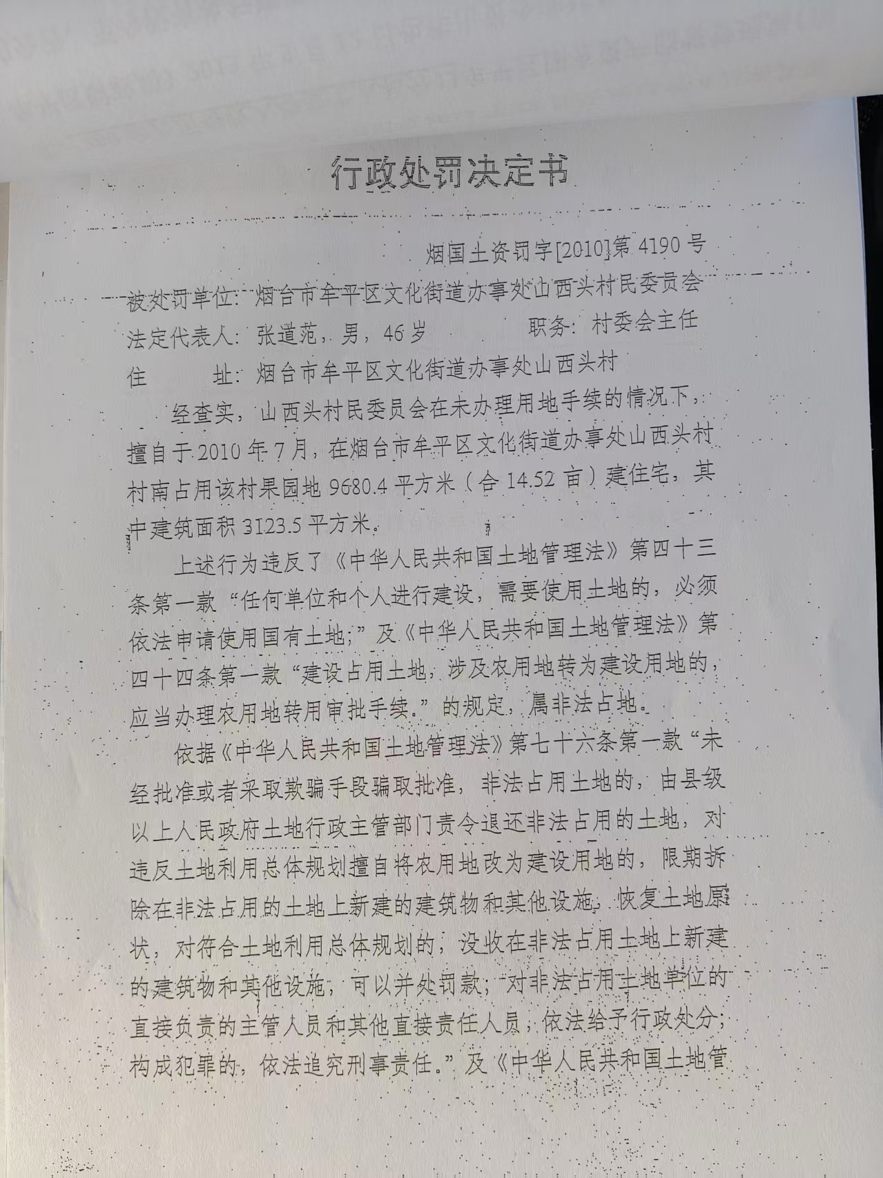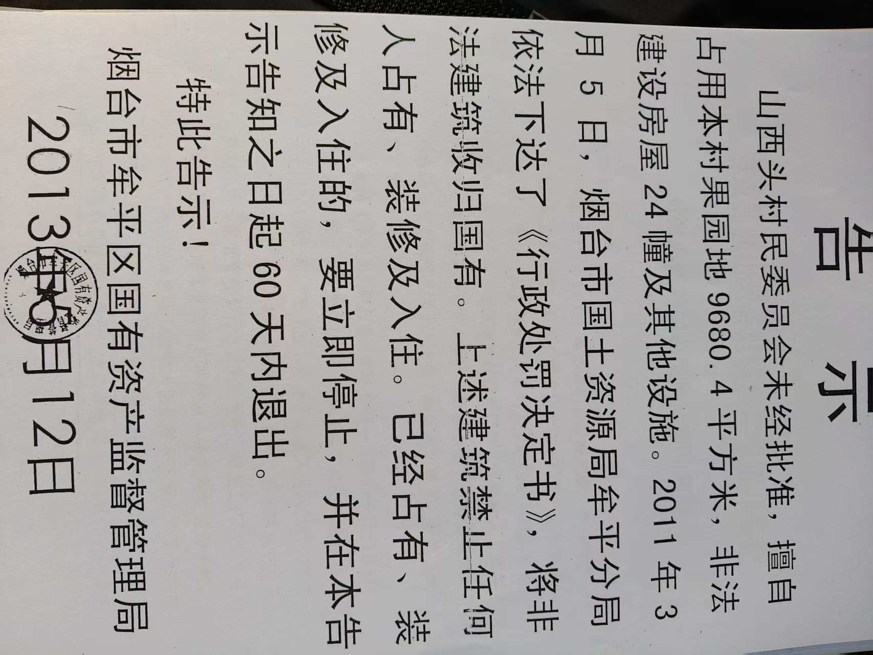 烟台市牟平区文化街道山西头村委2010年6月该村在没有政府审批手续的情况下非法破坏该村30余亩耕地搞起了房产开发违章建别墅24栋。2011年3月5日国土执法部门又对其违法建筑下达了《行政处罚决定书》责令退还非法占用的土地,没收非法建筑并处罚款,并将罚没建筑移交牟平区国资局。上述国有资产罚没后被该村前任书记与2011年12月至2013年4月将其盗卖, 780余万所得收入均被个人私分!!牟平区国有资产监督管理局(现牟平区财政局)2013年5月12日也作出责令非法住户60日予以退出的公告,至今没有执行清退!!同年牟平区国有资产监督管理局就此事向牟平区政府相关领导汇报至今没有结果,2015年山东省财政厅做出对非法出售24栋别墅所得收入予以追缴全额上缴国库!!2016年财政部驻山东省财政监察专员办认定该问题属于地方财政管理!!!2016年烟台市政府移交烟台市监察局处理至今没有结果, 2018年10月牟平区文化街道办事处出具证明该问题属于牟平区国有资产监督管理局管辖(现牟平区财政局)但至今牟平区财政局也没处理,2025年4月山东省政府将此事移交山东省信访局至今没有结果,2025年7月牟平区财政局发函牟平区自然资源局要求清退,牟平区自然资源局不予受理,2025年4月牟平区财政局移交牟平区公安分局公安机关不予受理.上述盗卖私分780余万的问题国有资产的问题不但至今没有处理,并且当地还有多家房屋中介大肆对外出售上述国有资产!!!